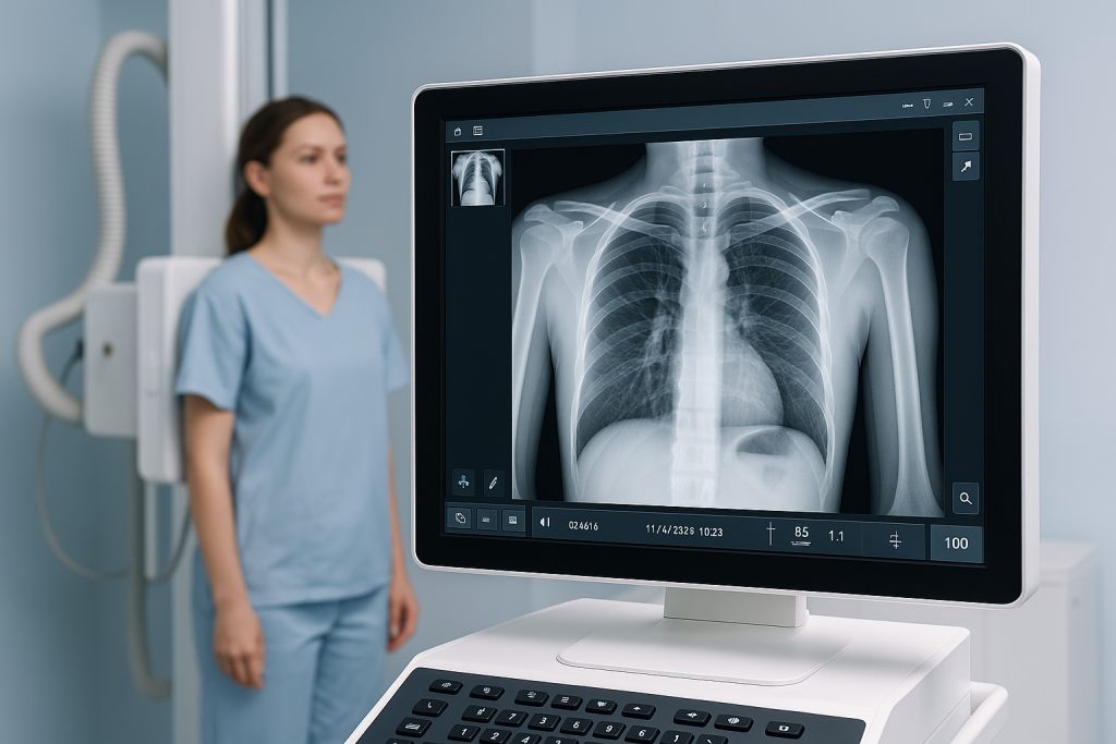 In unserer Praxis wird ein modernes volldigitales Röntgensystem mit kabelloser Paneltechnik, zur raschen Bildübertragung eingesetzt.